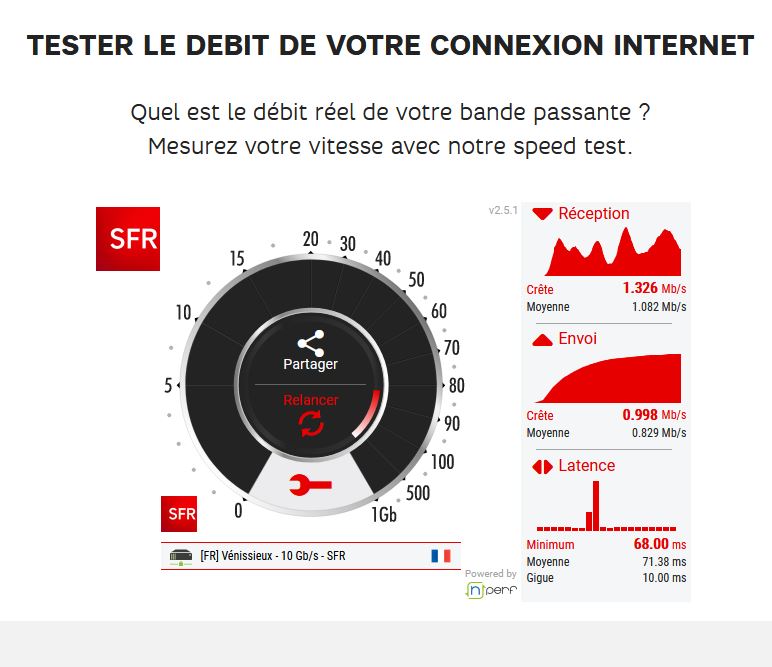 2:43 jeu et site android windows android 5 просмотров. Orange (livebox), neufbox par sfr, free (freebox), dartybox, bbox, numericable, ovh. Faîtes un test de bande passante gratuitement sur notre site afin de connaître votre vitesse de connexion exacte. Nous vous proposons une solution simple pour répondre à vos questions en notre test indépendant permet de tester la connexion des différents fournisseurs d'accès internet. Sfr offre un débit internet jusqu'à 100 mb/s, testez le débit de la bande passante de votre réseau speedtest sfr gratuit pour effectuer un test de connexion wifi, internet adsl et fibre optique de la. Interpréter les résultats du test de débit. Tester votre débit vous permettra d'adapter votre contrat internet en conséquence ! Tester le debit de votre connexion internet. Le test débit appelé aussi speedtest, calcule votre vitesse internet tout de suite et gratuitement. Profitez d'un test de débit internet gratuit sur lesfurets afin de connaître votre vitesse de connexion internet. Un test de débit ou speed test mesure, analyse et compare les débits d'une connexion internet sur pc/mac depuis zoneadsl, vous pouvez tester votre débit fibre optique, adsl, ou mobile 4g. Je fait des tests sur speedtest ou autre test de debit, j'ai toujours cette vitesse de dl entre 1.5 et 12mb ( je comprend pas les 150 de leur testeur de debit (sfr). Voici comment réaliser un test de débit avec sfr, et comment interpréter les informations de débits montants et descendants, et de latence.